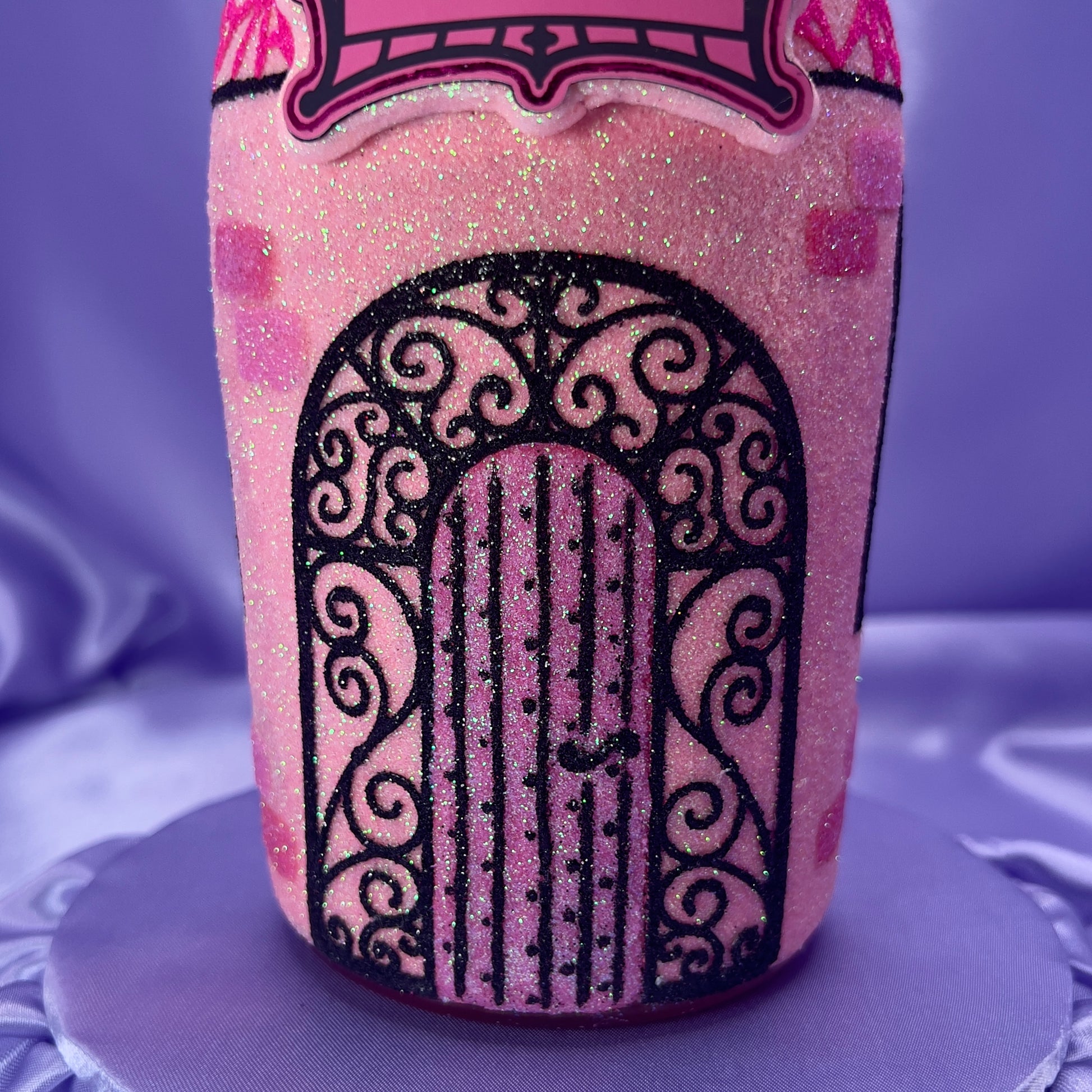 The Gothic Princess Manor is a bold statement piece inspired by ornate gothic architecture and the mystery of a princess's castle at dusk. Hand-decorated in soft blush pink glitter and contrasted with intricate black detailing, this design evokes romance, strength and timeless elegance.