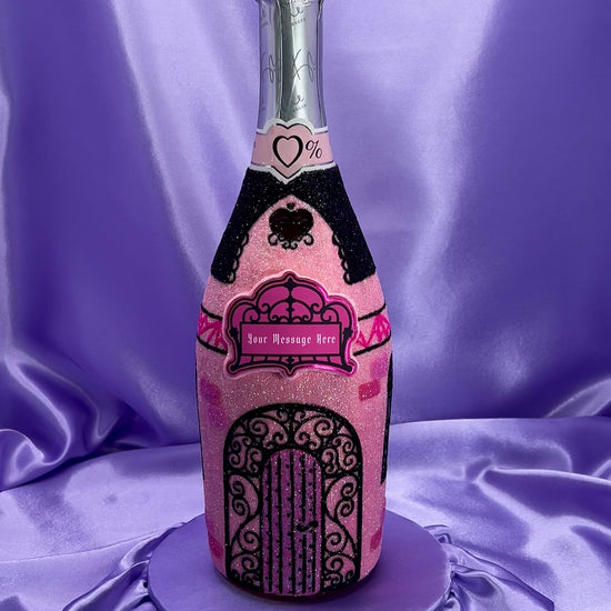 Featuring arched doorway motifs, filigree accents, and regal embellishments, each bottle feels like the entrance to a hidden manor - dramatic yet refined. The personalised label sits at the heart of the design, transforming the bottle into a bespoke keepsake as much as a celebration piece.